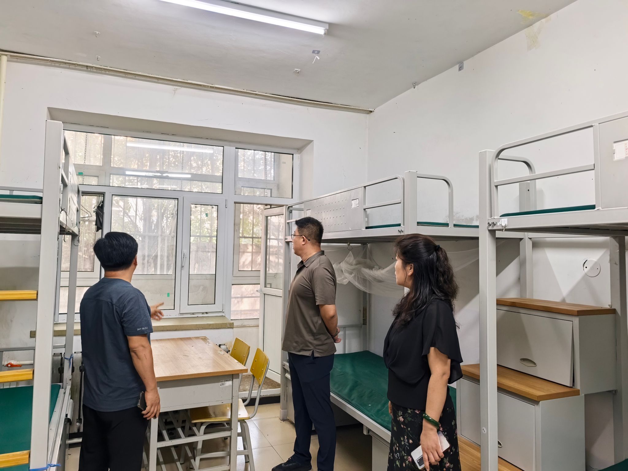 为给新同学提供安全、舒适的住宿环境,9月2日太阳集团tyc33455官网院长高庆忠、党总支书记刘闯、党总支副书记谢芳带领学院辅导员深入宿舍,开展新生入学前卫生安全排查与住宿问题梳理工作,对学生的床垫、储物柜、桌椅的配备情况进行了核查,排查安全隐患,从细节处把关,用行动为新生入学保驾护航,确保为新生们创造一个安全舒适、温馨、和谐的宿舍环境。